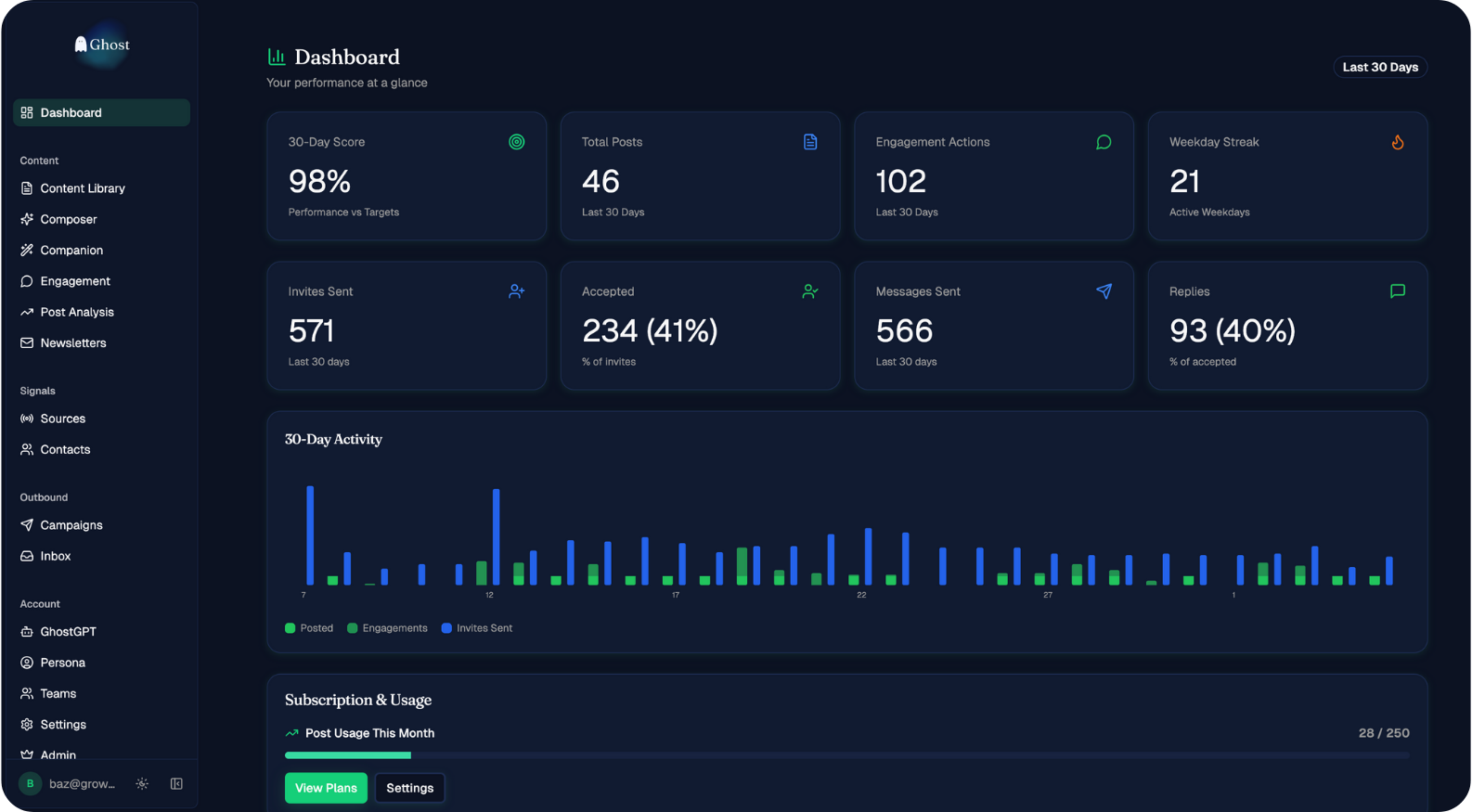 Ghosts Engagement tab turns commenting into a deliberate growth motion, using watchlists and ICP intent signals to surface the exact posts and people worth responding to each day.