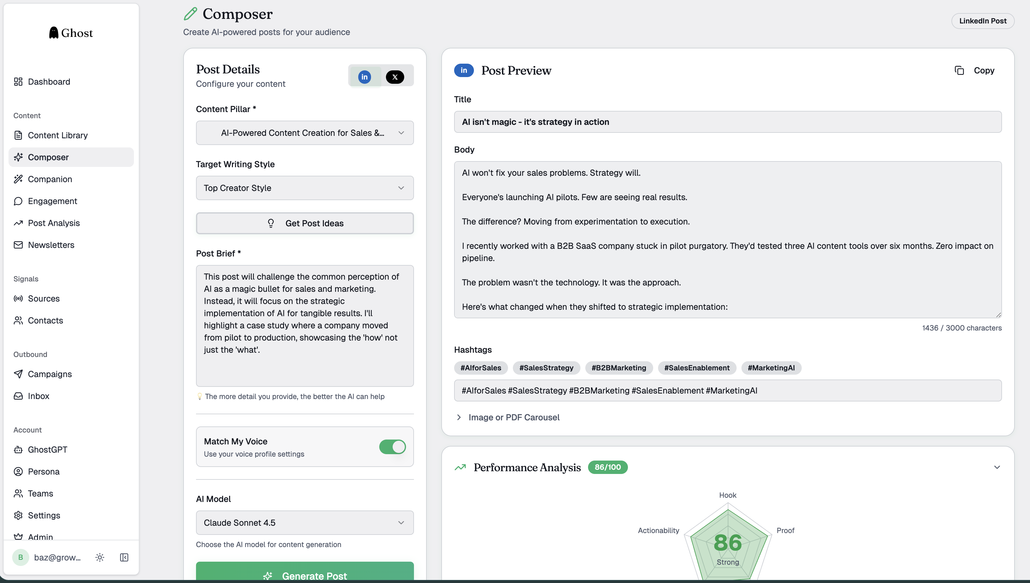 Our AI-powered Content Composer analyses every post across five key factors; Hook Strength, Proof Density, Authenticity, Value Delivery, and Actionability, to give instant performance feedback.